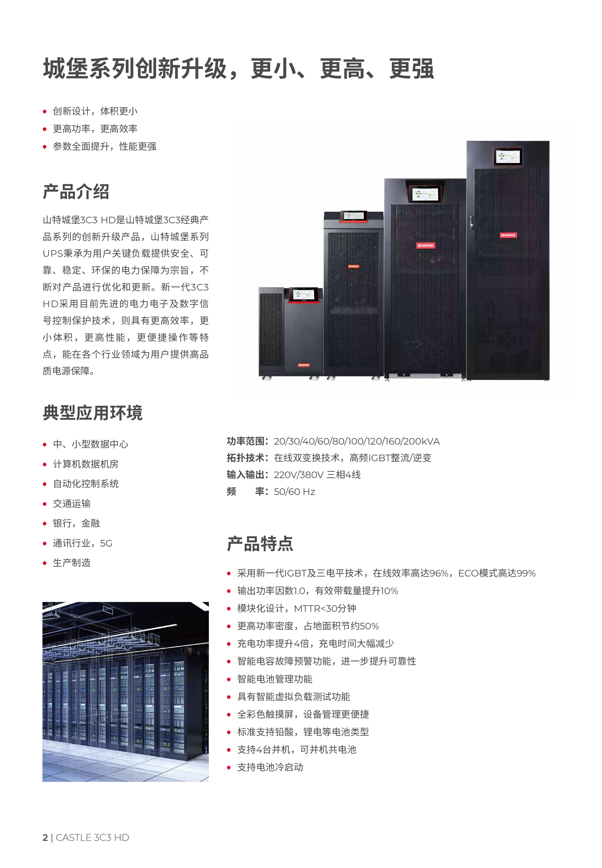应用场景中、小型数据中心计算机数据机房自动化控制系统交通运输银行,金融通讯行业,5G生产制造采用新一代IGBT及三电平技术,在线效率高达96%,ECO模式高达99%输出功率因数1.0,有效带载量提升10%模块化设计,MTTR<30分钟更高功率密度,占地面积节约50%充电功率提升4倍,充电时间大幅减少智能电容故障预警功能,进一步提升可靠性智能电池管理功能具有智能虚拟负载测试功能全彩色触摸屏,设备管理更便捷标准支持铅酸,锂电等电池类型支持4台并机,可并机共电池支持电池冷启动