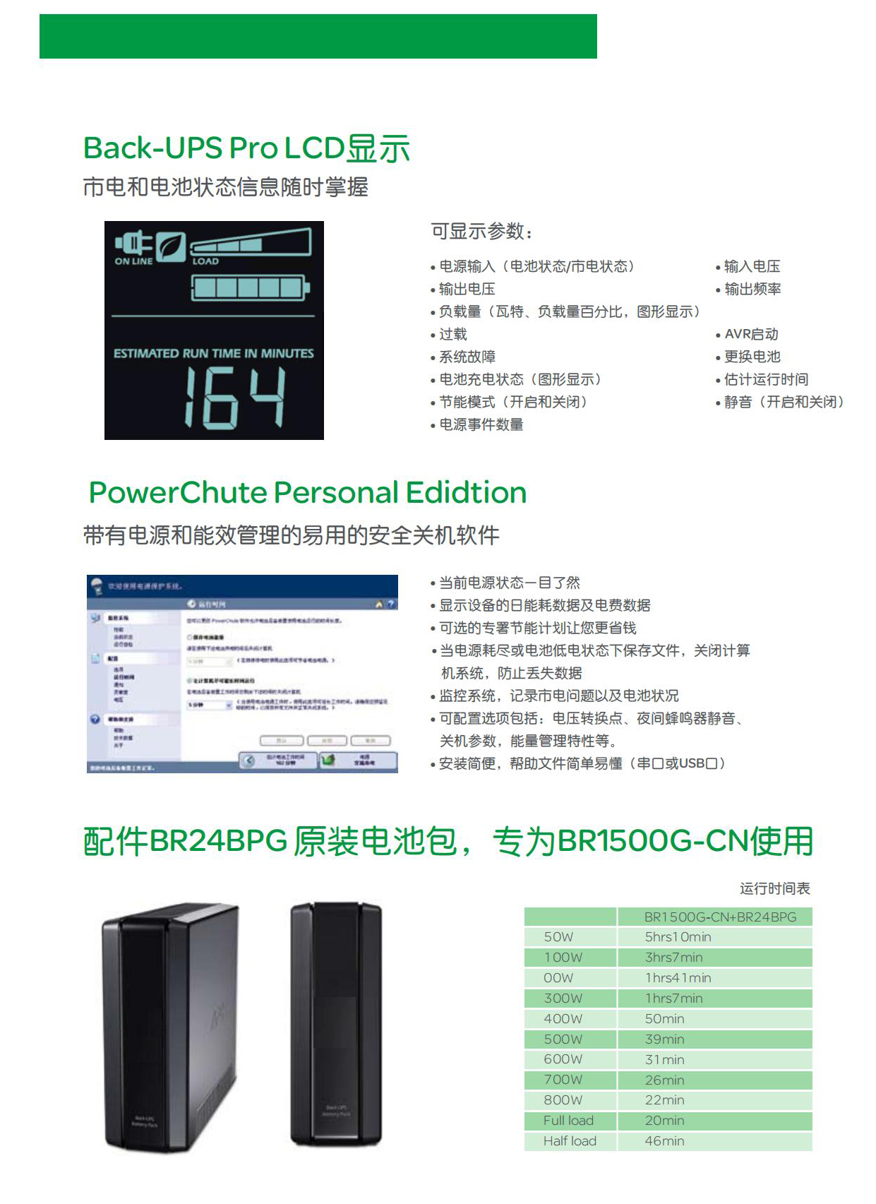Back-UPS Pro系列产品能够为您的家庭或企业中的高性能计算机系统、路由器/调制解调器、外部存储设备、游戏机和其它 电子设备提供有保障的电力保护。这些UPS能够在停电期间给电子设备提供冗余的备用电池并稳定不安全的电压。他们还提 供断电保护以防止破坏性的浪涌和尖峰,并允许使用管理软件,从而可以让您发挥UPS的较大功效。该UPS系列的高级功能 包括自动电压调节(AVR)、液晶显示器、智能插座,能够减少电力使用的节能功能、网络的可管理性、看门狗、或可配置 的插座。连同Back-UPS Pro系列的标准功能,对于保护您的数据并使您的系统保持可用来说它们是优秀的选择。