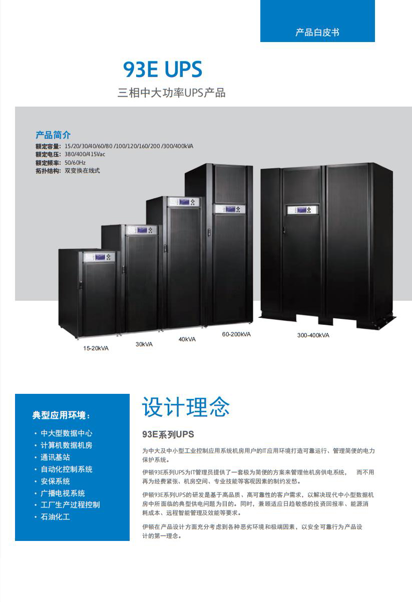 为中大及中小型工业控制应用系统机房用户的IT应用环境打造可靠运行、管理简便的电力保护系统。伊顿93E系列UPS为IT管理员提供了一套极为简便的方案来管理他机房供电系统, 而不用再为经费紧张、机房空间、专业技能等客观因素的制约发愁。伊顿93E系列UPS的研发是基于高品质、高可靠性的客户需求,以解决现代中小型数据机房中所面临的典型供电问题为目的。同时,兼顾适应日趋敏感的投资回报率、能源消耗成本、远程智能管理及效能等要求。伊顿在产品设计方面充分考虑到各种恶劣环境和极端因素,以安全可靠行为产品设计的第一理念。