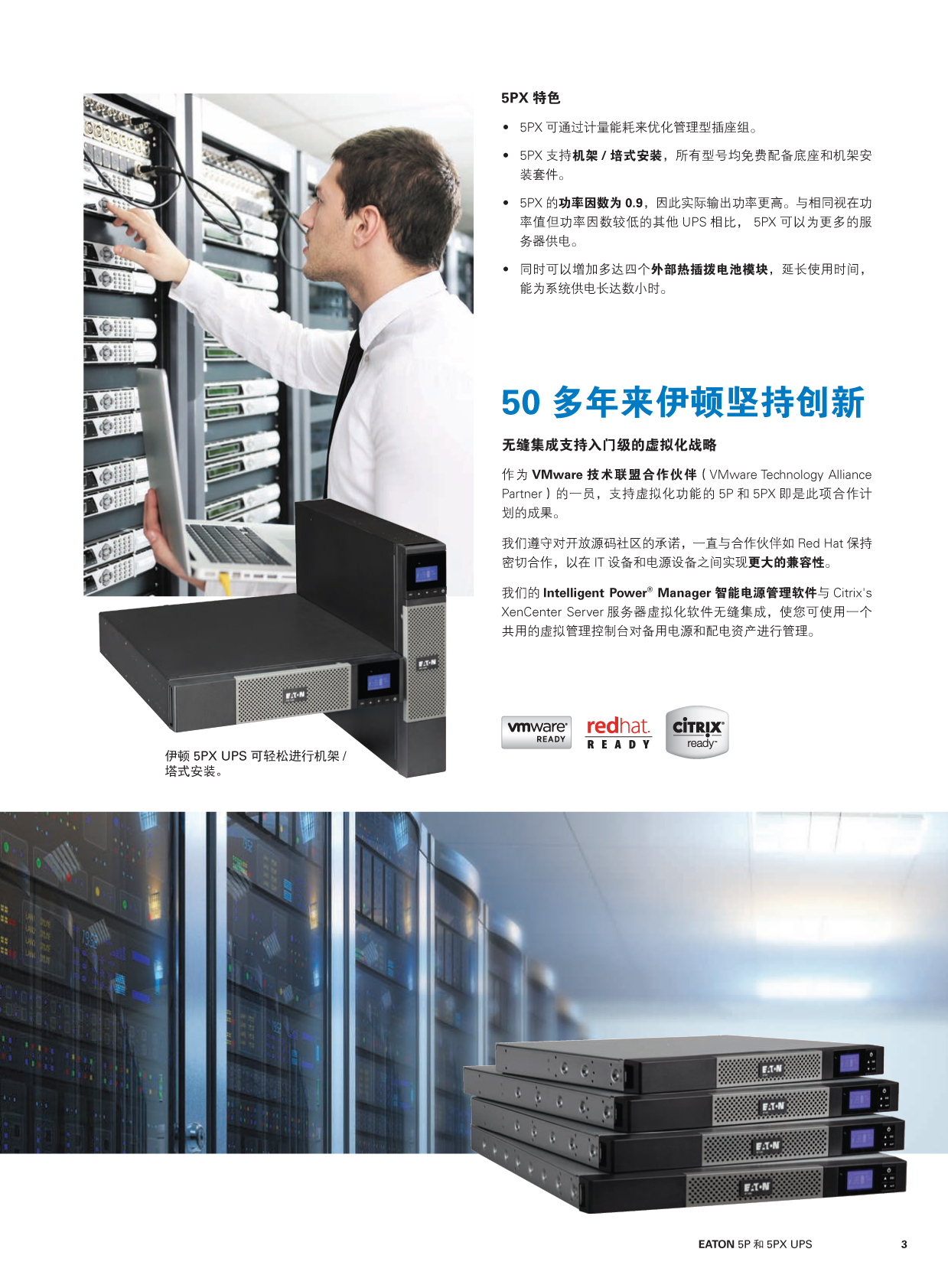 进行能效和性能优化以降低成本,这一点至关重要。Eaton 5P 和5PX 在服务器、存储设备和网络柜电源保护领域提供全新的 UPS产品,提供融合了目前大多数技术的功能,帮助您取得成功!Eaton 5P 和 5PX UPS 重要优势 :• 全新的图形液晶显示屏,在单个屏幕上清楚显示有关 UPS 状态和计量的信息(以 7 种语言显示)。增强的功能配置也可通过便捷的导航键进行操作。• 计量能耗,并通过液晶显示屏和电源管理软件提供 kWh 值。• 5P 能效高达 98%,而 5PX 能效高达 99%,大幅降低了制冷和电力成本。5P 和 5PX 对实时显示功耗做出优化,以支持更好的决策、延长系统正常运行时间、提高整体业务性能。