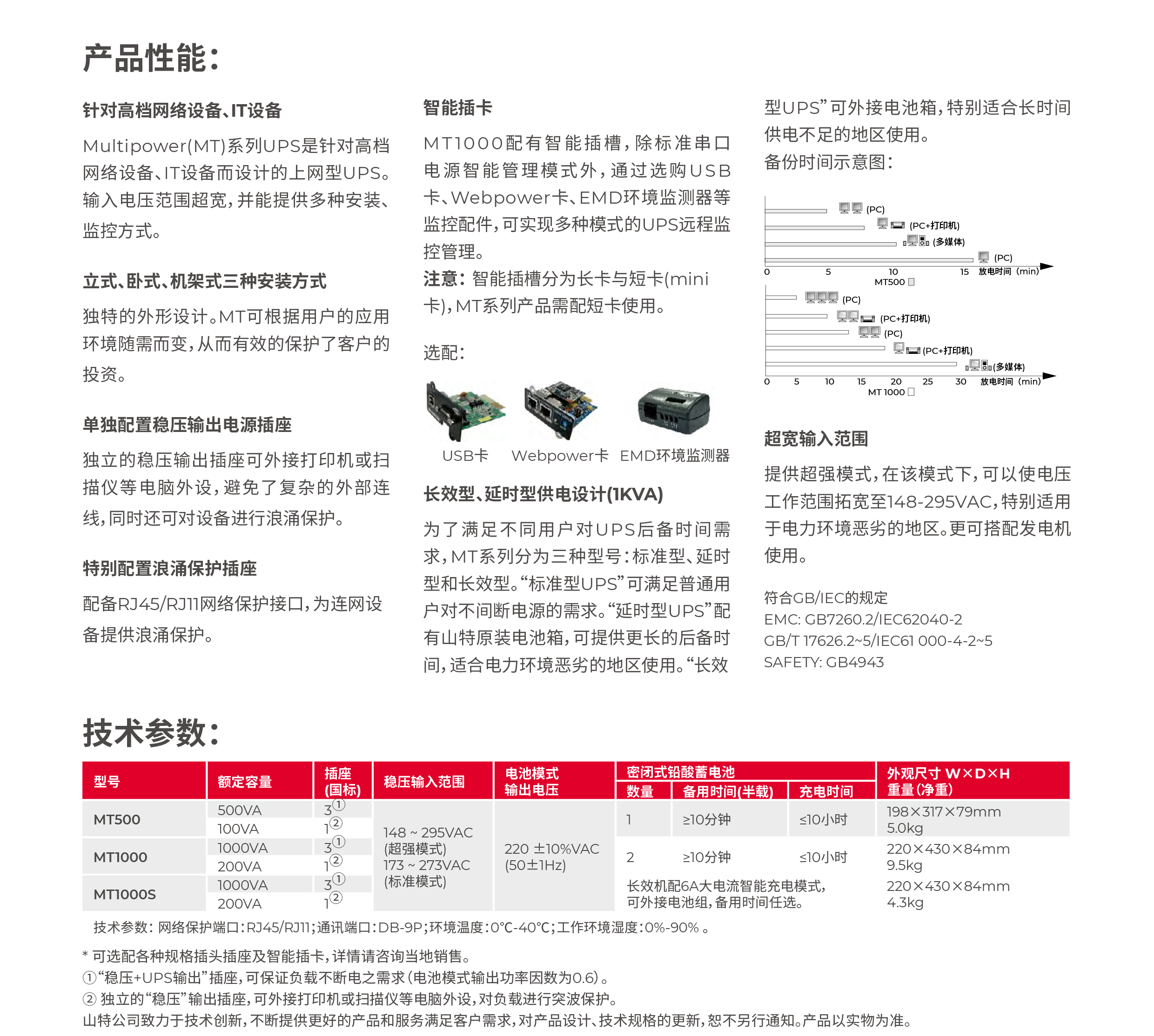 为了满足不同用户对UPS后备时间需求, MT系列分为三种型号:标准型、延时型和长效型。