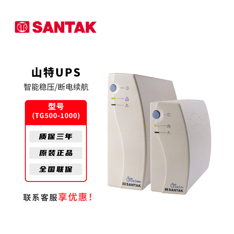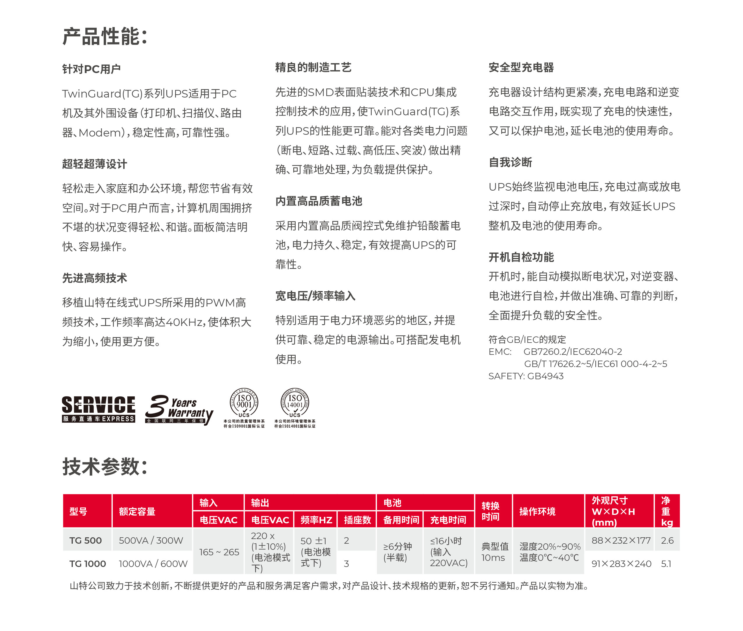 针对PC用户TwinGuard(TG)系列UPS适用于PC机及其外围设备(打印机、扫描仪、路由器、Modem),稳定性高,可靠性强。超轻超薄设计轻松走入家庭和办公环境,帮您节省有效空间。对于PC用户而言,计算机周围拥挤不堪的状况变得轻松、和谐。面板简洁明快、容易操作。先进高频技术移植山特在线式UPS所采用的PWM高频技术,工作频率高达40KHz,使体积大为缩小,使用更方便。精良的制造工艺先进的SMD表面贴装技术和CPU集成控制技术的应用,使TwinGuard(TG)系列UPS的性能更可靠。能对各类电力问题(断电、短路、过载、高低压、突波)做出精确、可靠地处理,为负载提供保护。内置高品质蓄电池采用内置高品质阀控式免维护铅酸蓄电池,电力持久、稳定,有效提高UPS的可靠性。宽电压/频率输入移植山特在线式UPS所采用的PWM高频技术,工作频率高达40KHz,使体积大为缩小,使用更方便。安全型充电器充电器设计结构更紧凑,充电电路和逆变电路交互作用,既实现了充电的快速性,又可以保护电池,延长电池的使用寿命。自我诊断UPS始终监视电池电压,充电过高或放电过深时,自动停止充放电,有效延长UPS整机及电池的使用寿命。开机自检功能开机时,能自动模拟断电状况,对逆变器、电池进行自检,并做出准确、可靠的判断,全面提升负载的安全性。
