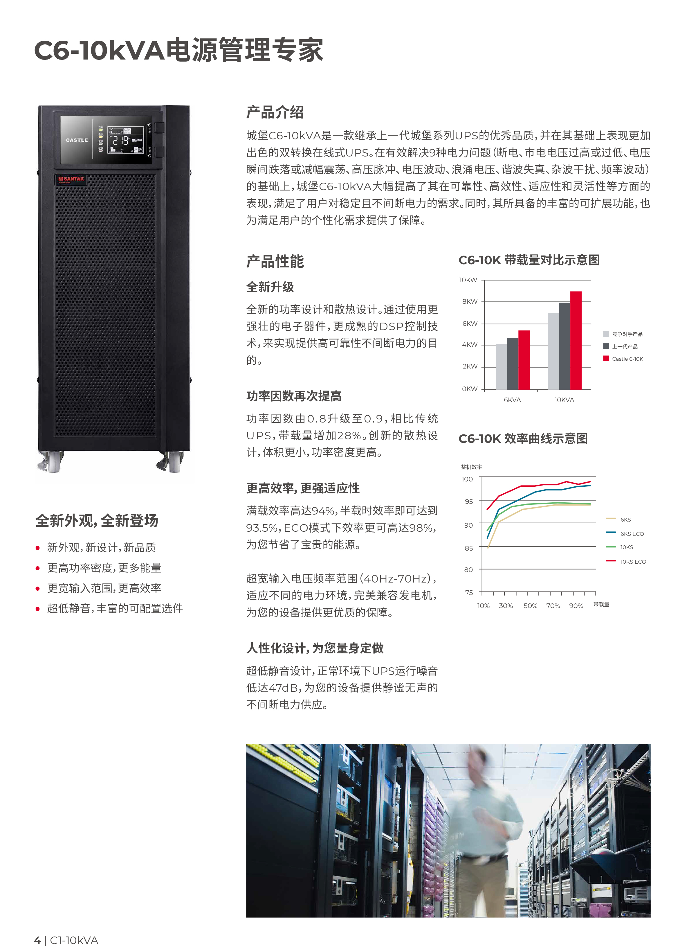 城堡系列塔式 C6-10kVA是一款继承上一代城堡系列UPS 的优秀品质,并在其基础上表现更加出色的双转换在线式UPS。在有效解决9 种电力问题(断电、市电电压过高或过低、电压瞬间跌落或减幅震荡、高压脉冲、电压波动、浪涌电压、谐波失真、杂波干扰、频率波动)的基础上,C6-10kVA大幅提高了其在可靠性、高效性、适应性和灵活性等方面的表现,全方位满足了用户对稳定且不间断电力的需求。同时,其所具备的丰富的可扩展功能,也为满足用户的个性化需求提供了保障。