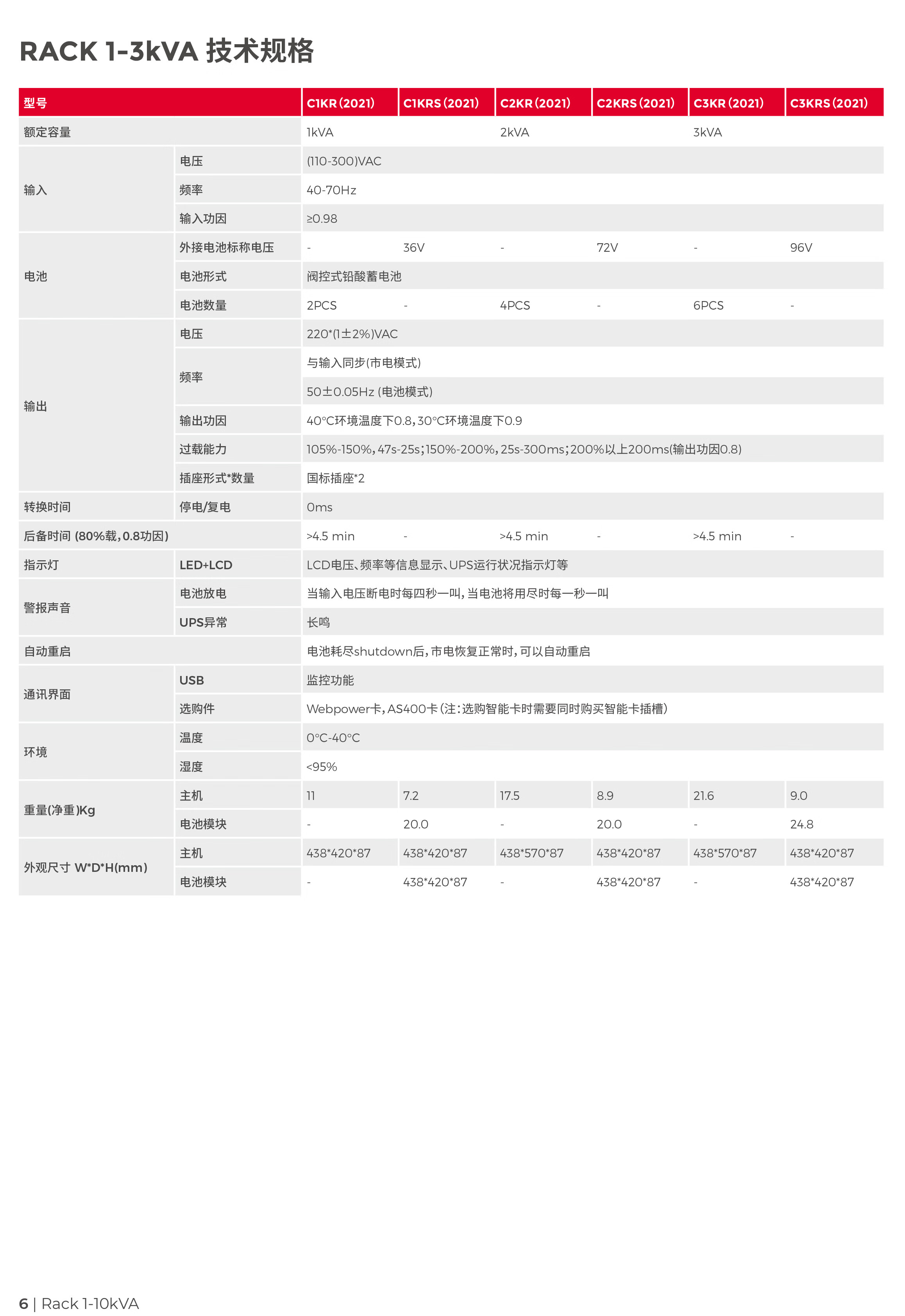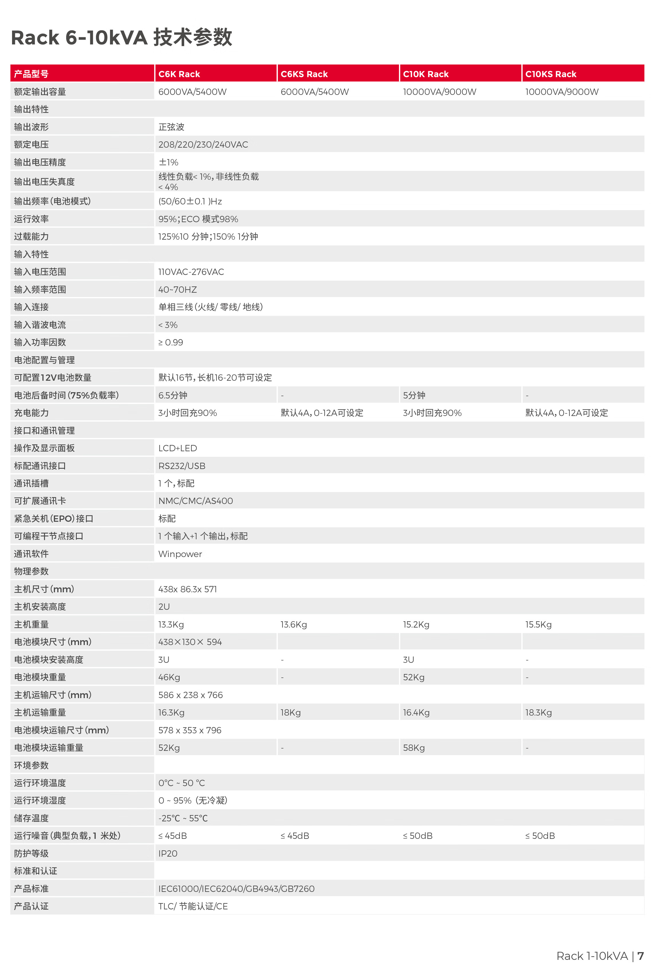 应用场景中小型企业、大型企业分支机构、银行网点等小型化数据中心存储器、网络设备、VoIP、通讯设备、自动化设备、Office 办公终端ATM 柜员机、广告机等设备输出功率因数0.9,完全匹配主流负载设备双转换效率95%,为用户节省大量能源开支CE标志,符合IEEE 标准,符合欧盟环保标准结构紧凑,10kVA只需2U高度,节省宝贵的机柜空间配置电池数量可调整,可根据用户电池数量设置匹配参数高温环境验证,可适应50摄氏度环境温度运行超强充电能力,满足长时间后备电池配置及快速充电需求低噪音模式设计,舒适的使用体验支持并机扩展,提升系统容量及系统冗余度丰富的选配件,可满足用户的差异化需求,包含:网络监控卡、Modbus/CMC卡、可编程干节点卡、并机组件、维修旁路、主机导轨、电池模块导轨