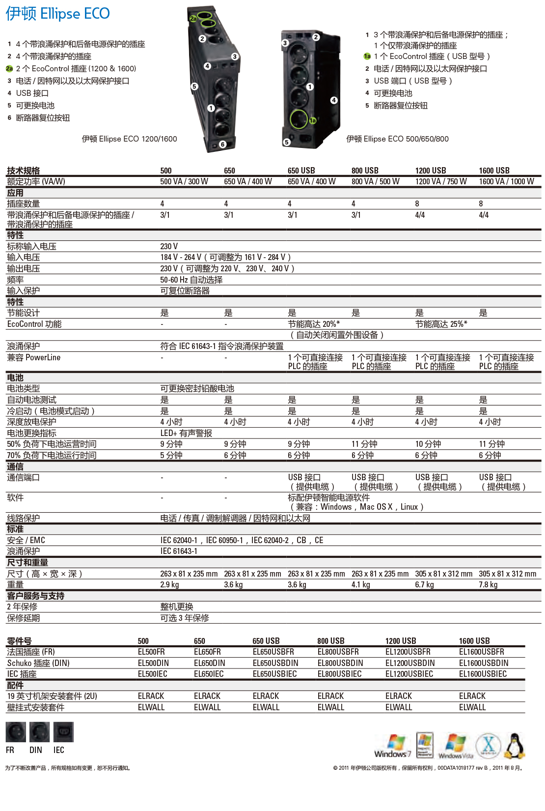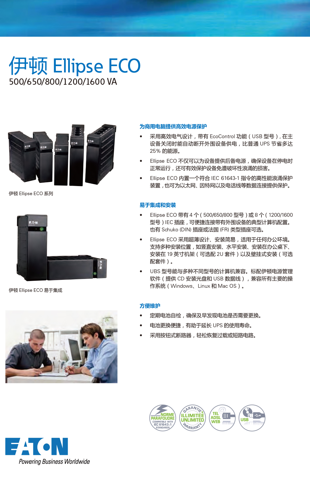 伊顿UPS不间断电源ECO系列650-1600USBIEC企业机房服务器备用电源